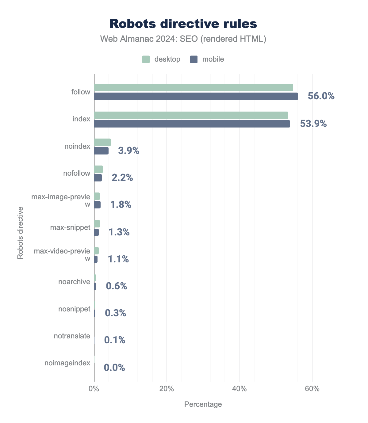 The most prominent rules in 2024 were follow (54.7% desktop; 56.0% mobile), index (53.4% desktop; 53.9% mobile), noindex (4.7% desktop; 3.9% mobile), and nofollow (2.5% desktop; 2.2% mobile). This is noteworthy since neither “index” nor “follow” directives have any function and are ignored by Googlebot. Google’s documentation on robots tags advises that “The default values are index, follow and don’t need to be specified.”