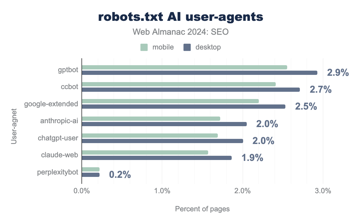 robots.txt files. For desktop, GPTBot is 2.9%, CCBot is 2.7%, Google-Extended is 2.5%, Anthropic-Ai is 2.1%, ChatGPT-User is 2.0%, Claude-Web is 1.9%, and PerplexityBot is 0.2%. The numbers for mobile are slightly slower than desktop at 2.6%, 2.4%, 2.2%,1.7%, 1.7%, 1.6%, and 0.2%, respectively.robots.txt AI user-agent usage.