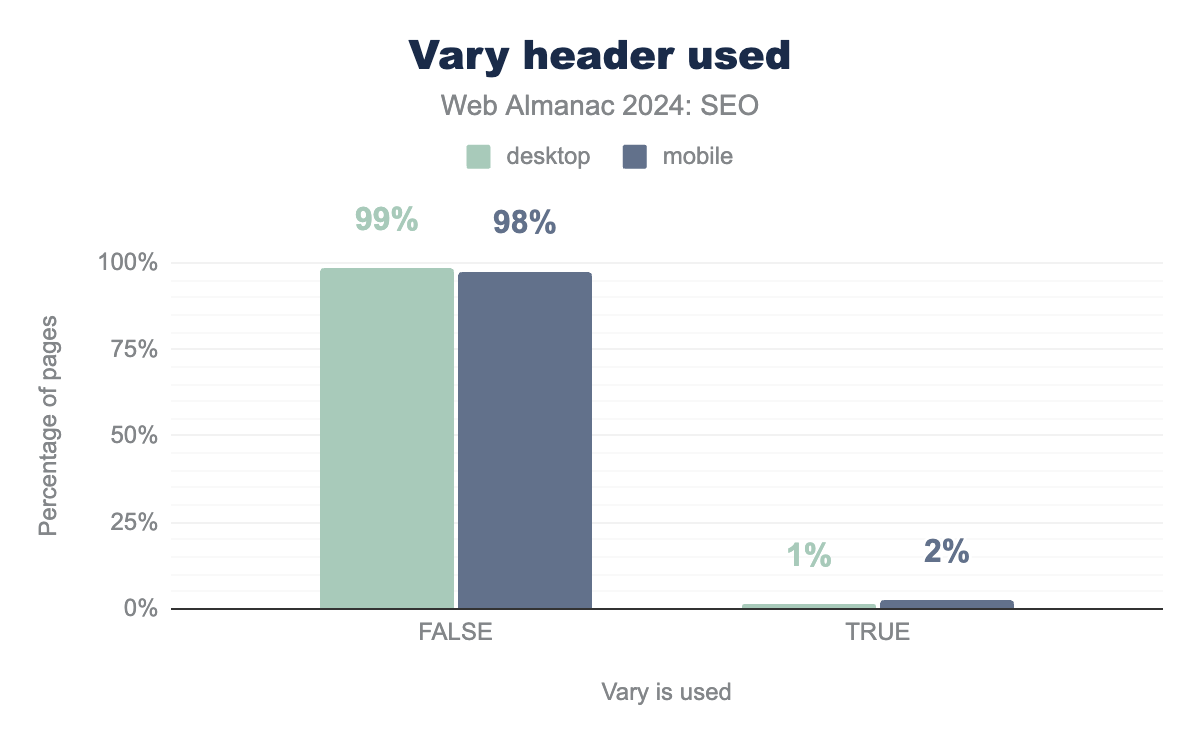 canonical tag usage was up slightly in 2024. In 2022, 61% of mobile and 59% of desktop pages used canonical tags. In 2024, it was up to 65% of mobile and 69% of desktop pages.