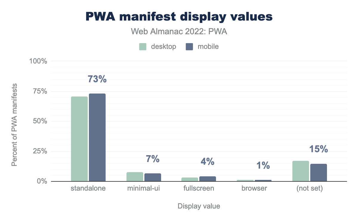 standalone 是最常用的 display 值,桌面端占比 71%,移动端占比 73%,minimal-ui 分别占 8% 和 7%,fullscreen 占比为 3% 和 4%,browser 为 1% 和 1%,而 17% 的桌面和 15% 的移动 PWA 网站没有设置该成员。display:standalone 是最常见的 display 模式,几乎 3/4 定义了 display 模式的网站都使用这个值。它也是使应用可安装的 display 模式之一。