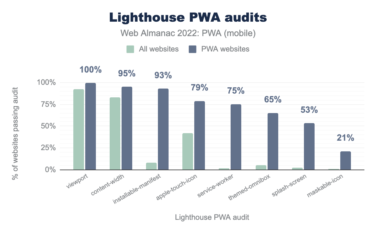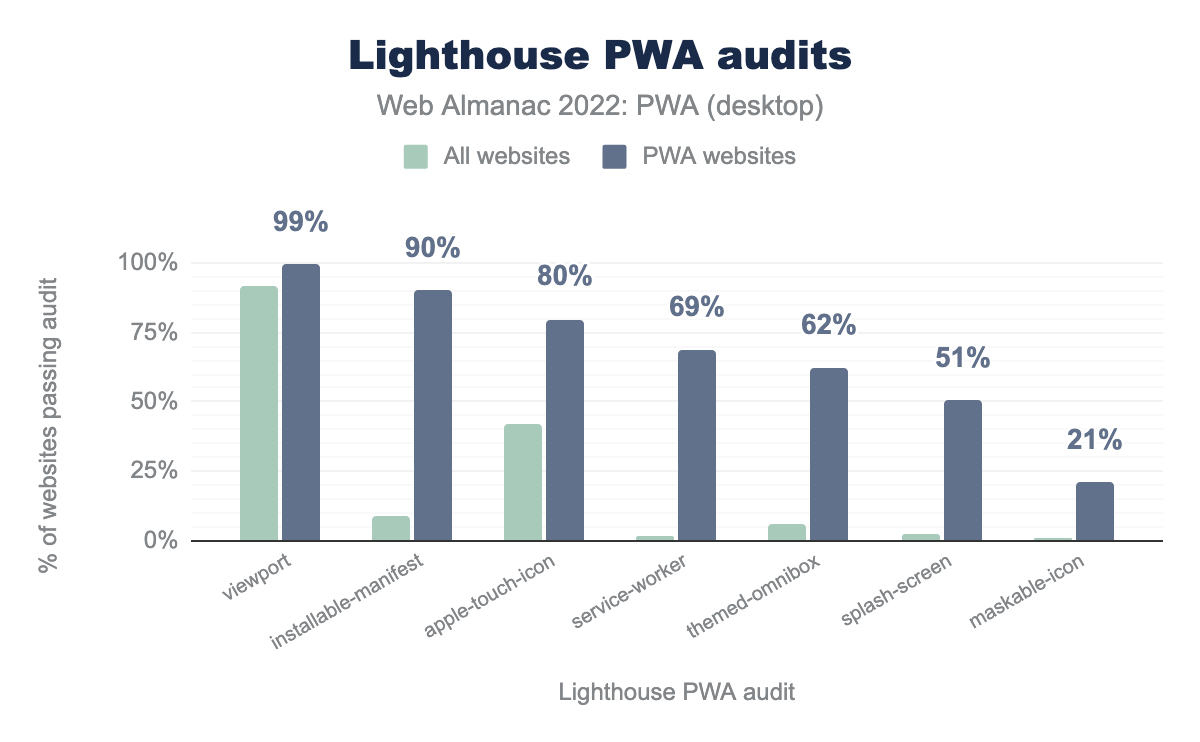 viewport:桌面端网页 92%,桌面端 PWA 99%;installable-manifest 分别为 9% 和 90%;apple-touch-icon 为 42% 和 80%;service-worker 为 2% 和 69%;themed-omnibox 有 6% 和 62%;splash-screen 有 3% 和 51%;maskable-icon 在所有桌面网站中有 1% 而在桌面 PWA 中占比 21%。与普通的网站相比,通过 PWA 审计的 PWA 网站更多并不奇怪,尽管某些审计例如 viewport meta 标签 以及 apple-touch-icon 也经常出现在非 PWA 网站中。