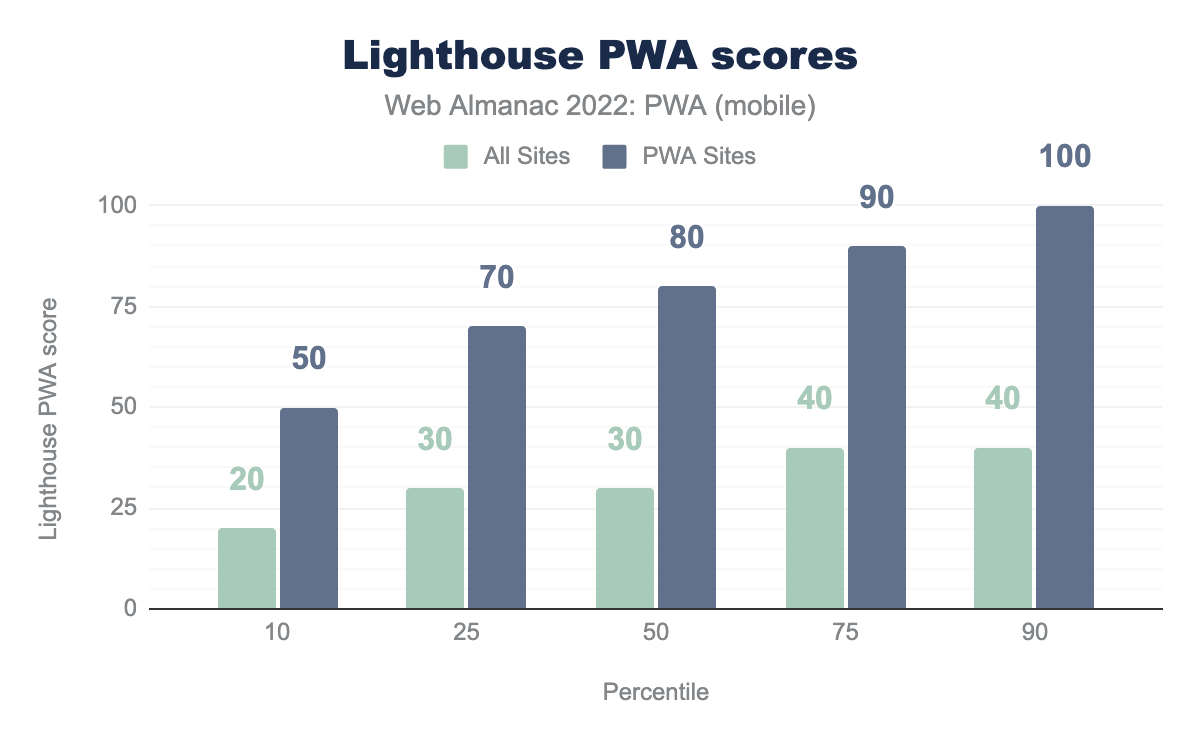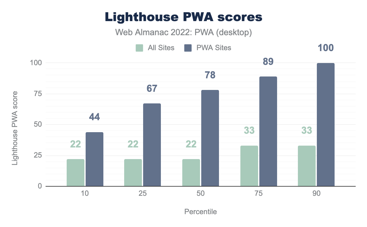 Lighthouse 是一个开源的自动化工具,用于提升网页质量。 它可在网站中运行很多检测,特别是专用于 PWA 类别的审计。 已有数据阐明了过去 12 个月关于 PWA 的一些有趣的事实。