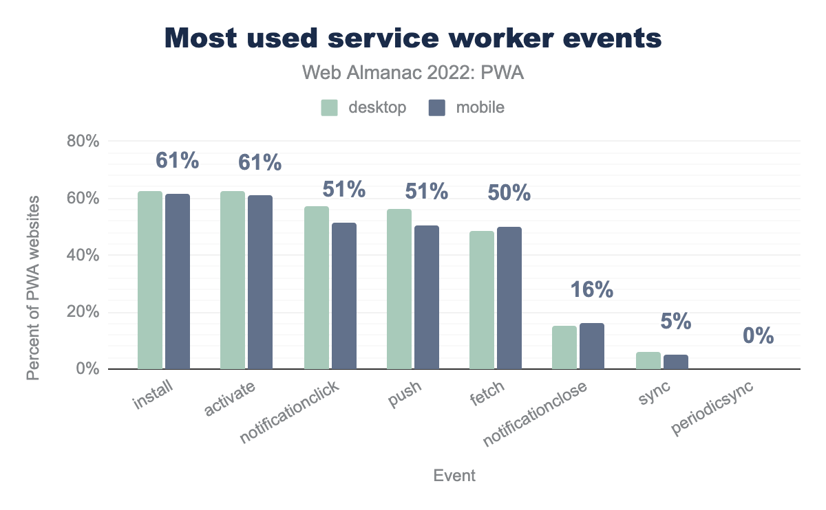 Service Worker 需要处于活动状态才能接收诸如 fetch 和 push 之类的事件。它们是 Service Workers 的基石,因此在桌面端有 63%,以及移动端有 61% 用于安装 和 激活。