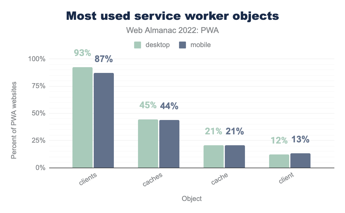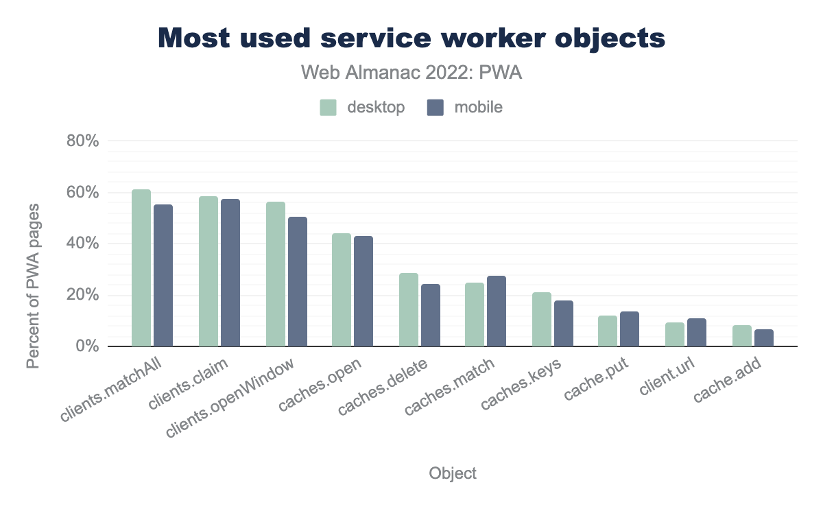 clients 对象,caches 的使用率分别为 45% 和 44%,cache 占比为 21% 和 21%,最后是 client,桌面端为 12%,移动端 PWA 网站为 13%。这些是最常用的对象方法: