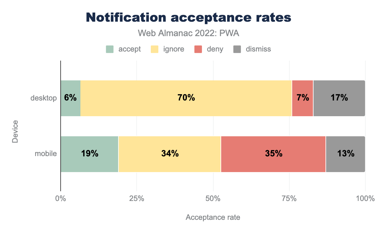 随着通知支持的增长和不同平台用户体验的改进,在接受通知方面没有重大变化。自 2020 年初以来,桌面端接受率约为 6%,移动设备接受率为 20%。