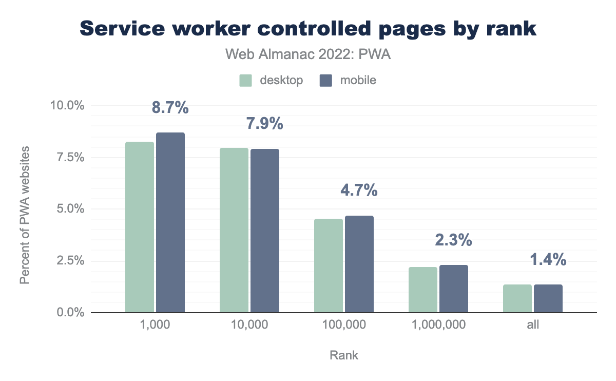 - 遵循去年推出的相同指标, 网站中 Service Worker 的使用率在桌面端和移动端分别达到 1.63% 和 1.81%。