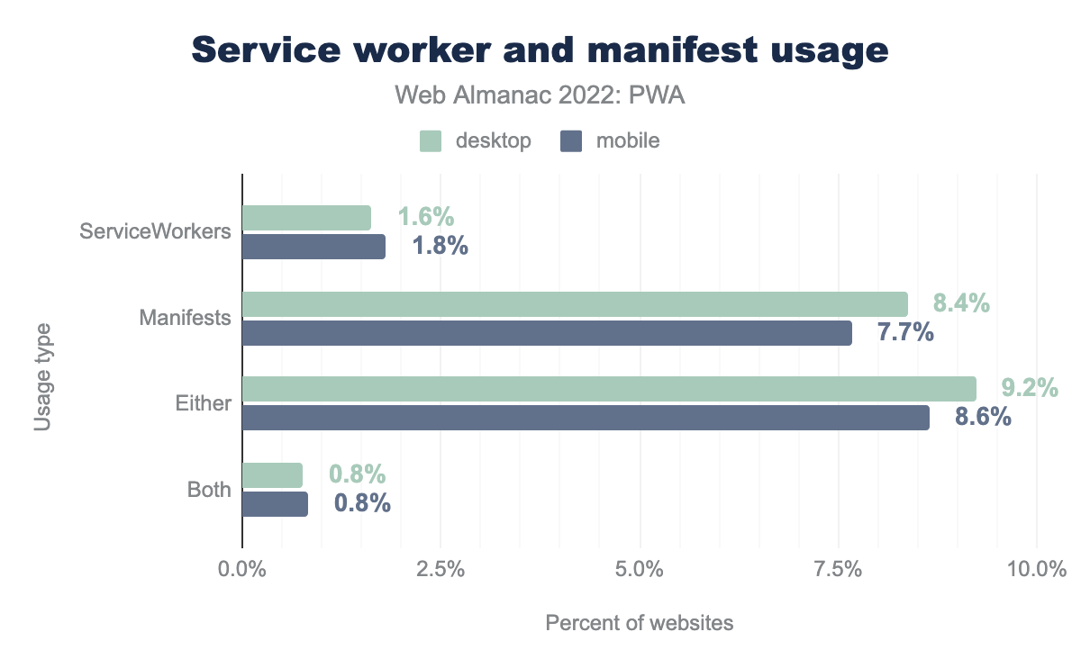 只有一小部分网站(桌面和移动设备上均为 0.8%)同时实现了 Service Worker 和 manifest 文件,这意味着只有不到 1% 的网站可以像原生应用一样安装到设备上。