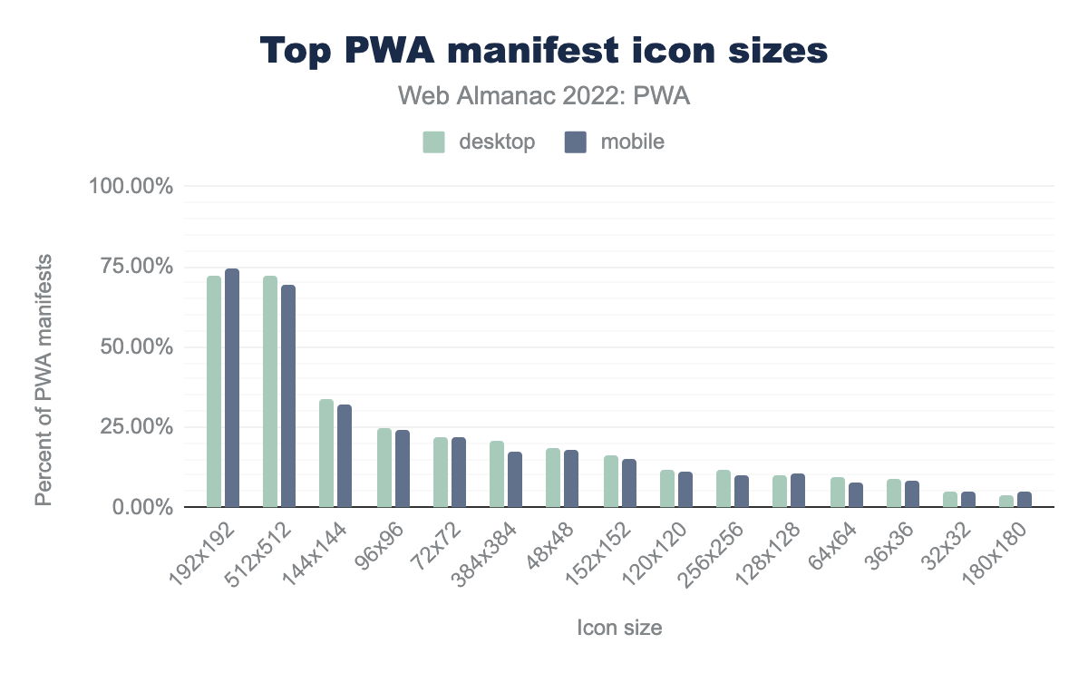 192x192 的桌面端占比为 72%,移动端占比为 74%;512x512 分别占 72% 和 69%,144x144 占 34% 和 32%,96x96 占 25% 和 24%,72x72 占 22% 和 22%,384x384 占 20% 和 18%,48x48 占 19% 和 18%,152x152 占 16% 和 15%,120x120 占 12% 和 11%,256x256 占 12% 和 10%,128x128 占 10% 和 11%,64x64 占 9% 和 7%,36x36 占 9% 和 8%,32x32 占 5% 和 5%,180x180 占比分别为 4% 和 5%。PWA 需要生成不同的图标大小,以适应推广和显示应用的需要。很多工具支持生成桌面和移动设备所需的大量图标。Manifest 文件中最常见的两种图标大小是 192x192 和 512x512。在所分析的 manifest 文件中,这两种大小都出现的情况大约占 70%。
