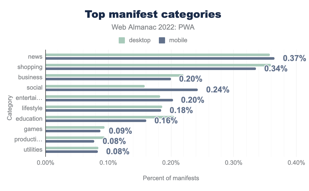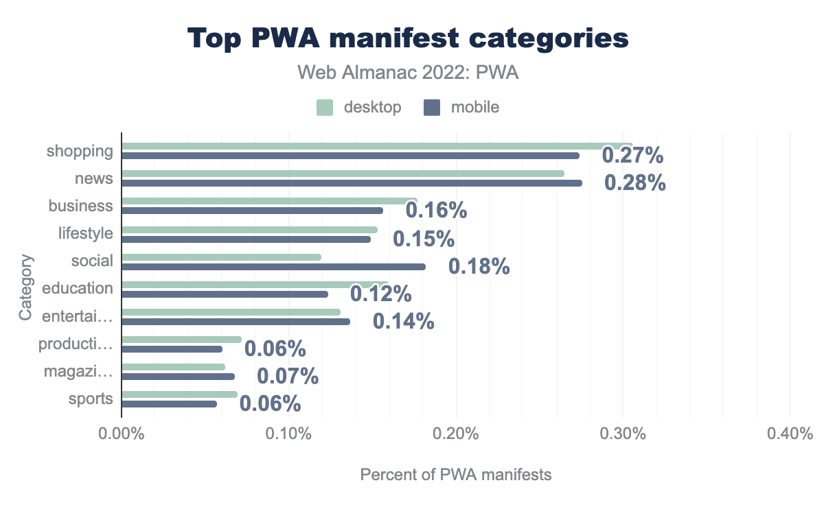 新闻类别的桌面端占比为 0.36%,移动端为 0.37%;购物类别的桌面端占比为 0.36%,移动端为 0.34%;商业类别的桌面端占比为 0.22%,移动端为 0.20%;社交类别的桌面端占比为 0.16%,移动端为 0.24%;娱乐类别的桌面端占比为 0.18%,移动端为 0.20%;生活方式类别的桌面端占比为 0.19%,移动端为 0.18%;教育类别的桌面端占比为 0.21%,移动端为 0.16%;游戏类别的桌面端占比为 0.09%,移动端为 0.09%;生产力类别的桌面端占比为 0.09%,移动端为 0.08%;工具类别的桌面端占比为 0.08%,移动端为 0.08%。普通网站和 PWA 的顶级类别基本一致,但略有不同。 前三类别是购物,新闻和商业。