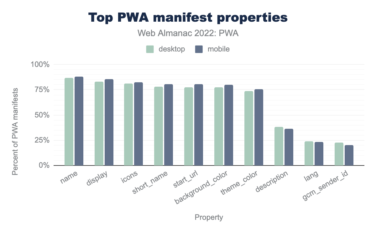 name,display 分别为 83% 和 85%,icons 为 81% 和 83%,short_name 为 78% 和 81 %,start_url 为 77% 和 81%,background_color 为 78% 和 80%,theme_color 为 73% 和 76%,description 为 38% 和 37%,lang 为 24% 和 24%,最后 gcm_sender_id 则是 23% 和 21%。与去年相比,今年 manifest 文件中使用的顶级成员没有显著变化。