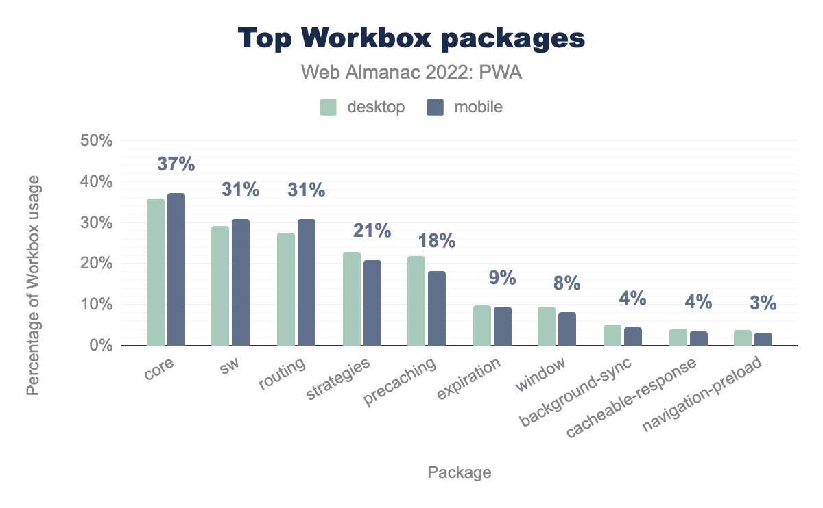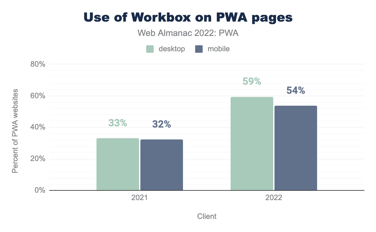 与去年相比,我们看到 Workbox 的使用量出现了大幅增长。 去年,它在移动设备上的使用率为 33%,而今年为 54%,近 60% 的桌面 PWA 在一定程度上使用了 Workbox。